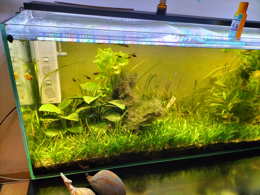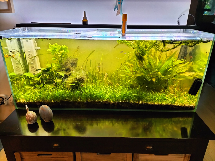 Aquarium 240 Litres complet 120 x H 50 x Prof 40 Rampe lumineuse programmable, imite la course du soleil 2 Filtres (1 en place, l'autre prêt à être installé quand on nettoie le 1er) + mousse et cartouches supplémentaires. Lot de produits de soins, Ph mètre électronique, Nourriture, 2 épuisettes Lot d'outils de nettoyage (différentes brosses et goupillons) Planté avec poissons. Plus de photos sur demande