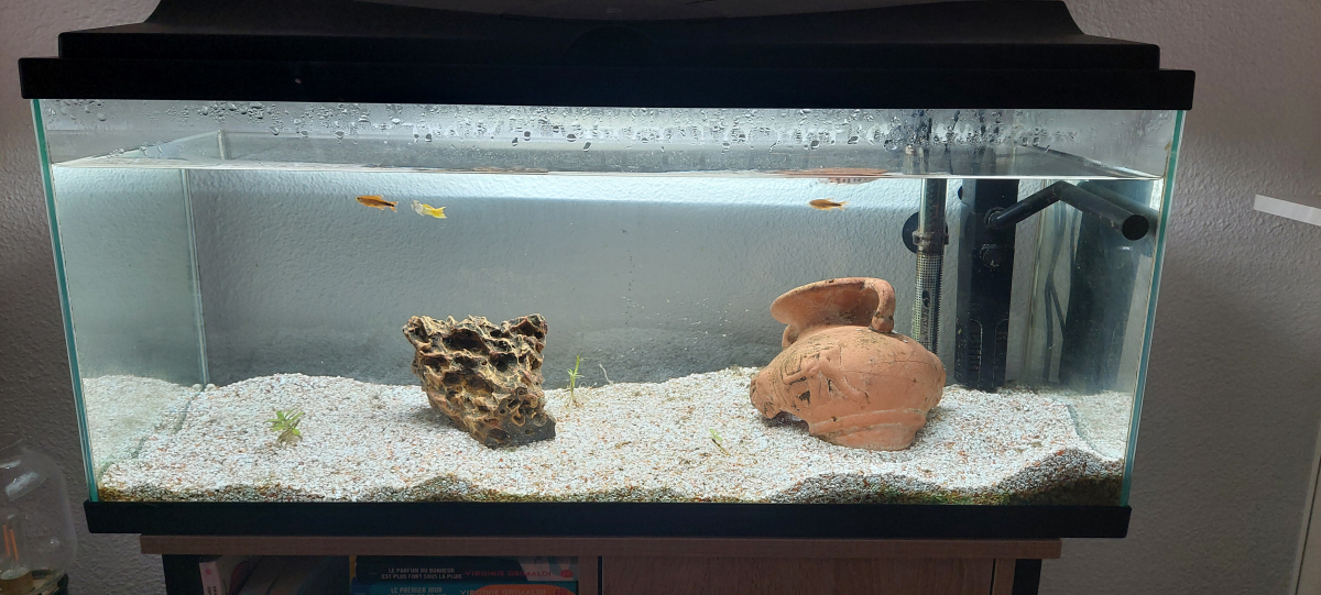 L'Aquarium pour poisson Tropical 80 noir Pure Family présente un volume utile de 74L et est adapté pour les poissons d'eau douce. Ce kit complet comprend un filtration CF80 : 380L/h, des mousses et des cartouches de taille M à racheter, un système d'éclairge LED intégré 8W et d'un chauffage de 100W. Il y a encore quelques poissons, un guppy, un poisson rayé qui mange les petits escargots, un escargot qui nettoie les vitres, une crevette et 3 poissons dont j'ai oublié le nom.. Une amphore et une pierre , ce qui est visible sur la photo!!! A récupérer sur place !