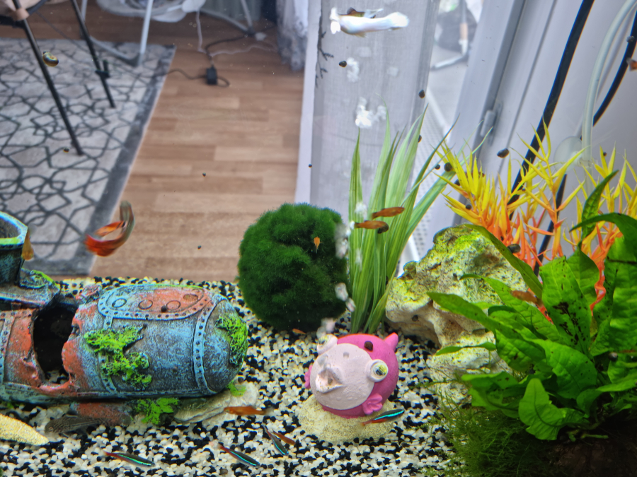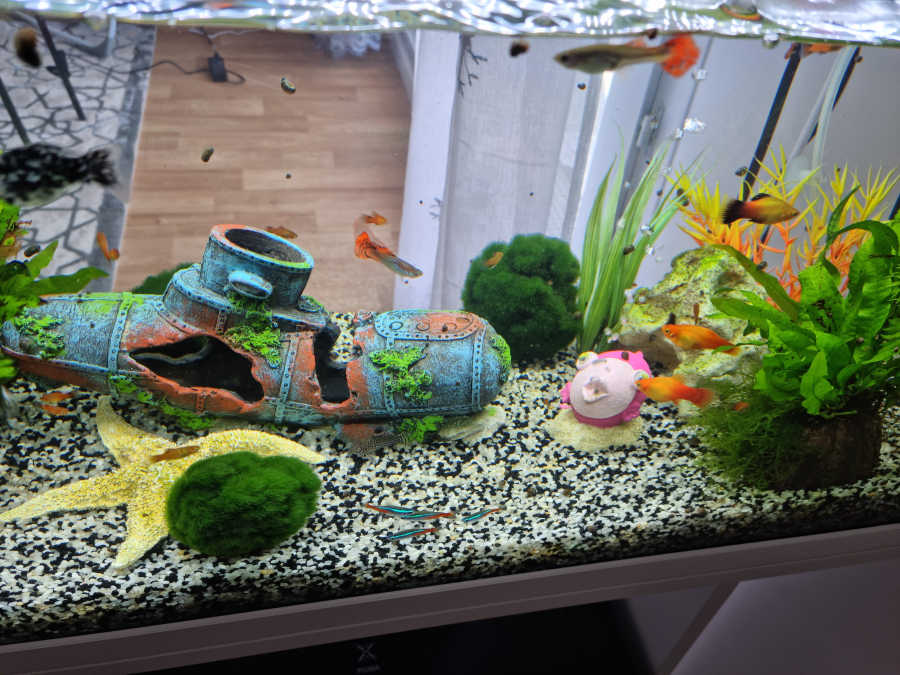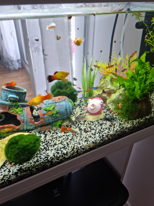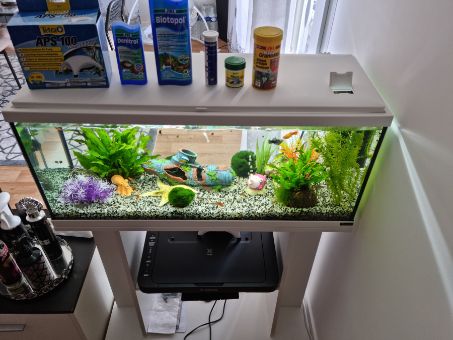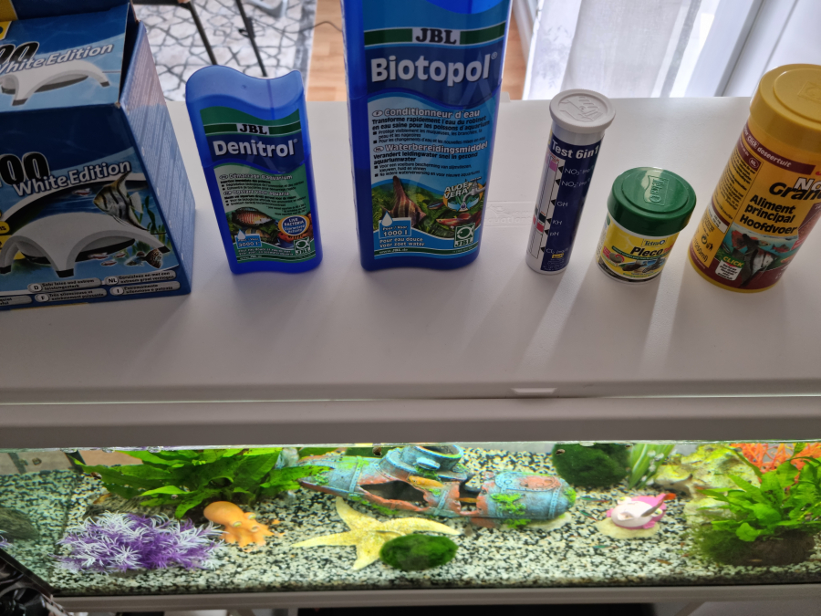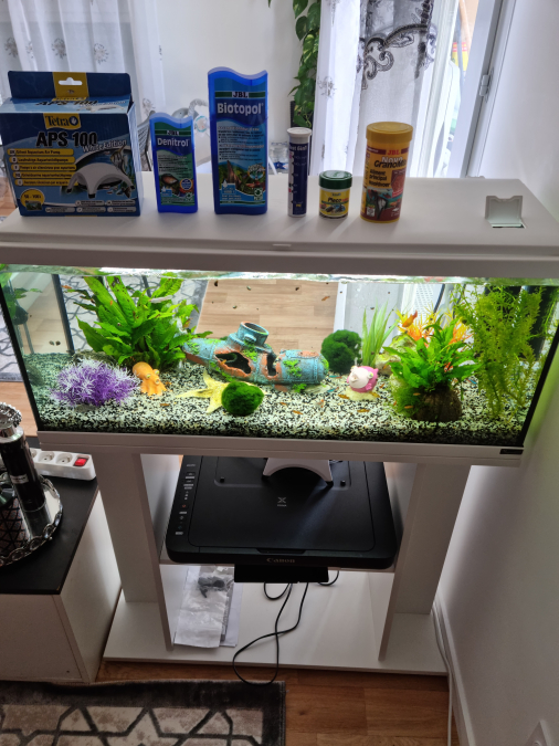 A cause des voyages fréquents je vend mon aquarium 85 litres comme neuf avec meuble blanc L'aquarium est équipé de : -Chauffage -Filtre -Lampe Led -Pulseur d'air -Décors -plusieurs plantes Le plan de la décoration de l'aquarium étais fait chez truffaut Les différentes espèces dans l'aquarium : 10 néon bleue 3 guppy : 2 femelles et 1 male 3 molly : 2 femelles et 1 male 3 platy : 2 femelles et 1 male Plusieurs bébés platy 2 Crevettes 2 mangeurs de fonds Quelques escargos La facture étais faite à mon nom pour le prix de 450 euro Je vend tout à 340 euro. Pour plus d'info merci de me contacter. Premier arrivé Premier servi