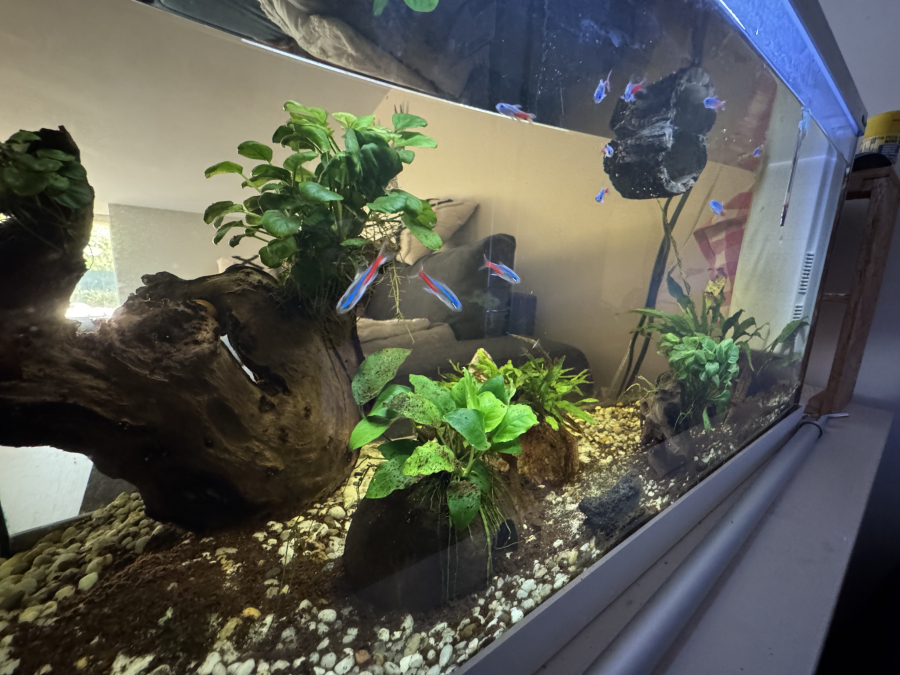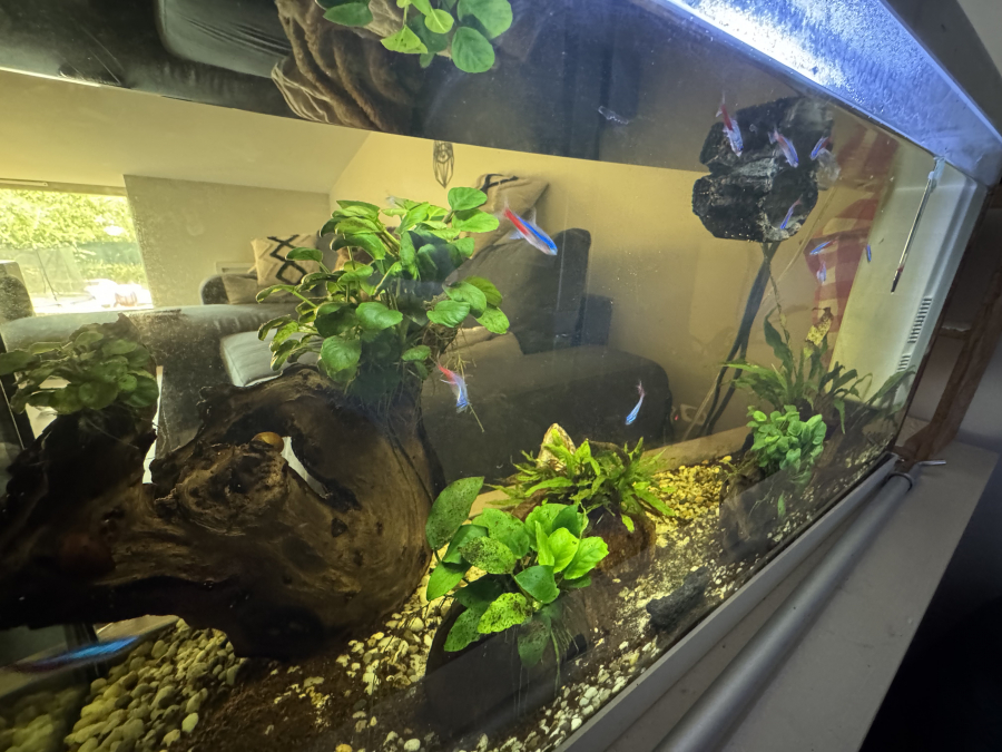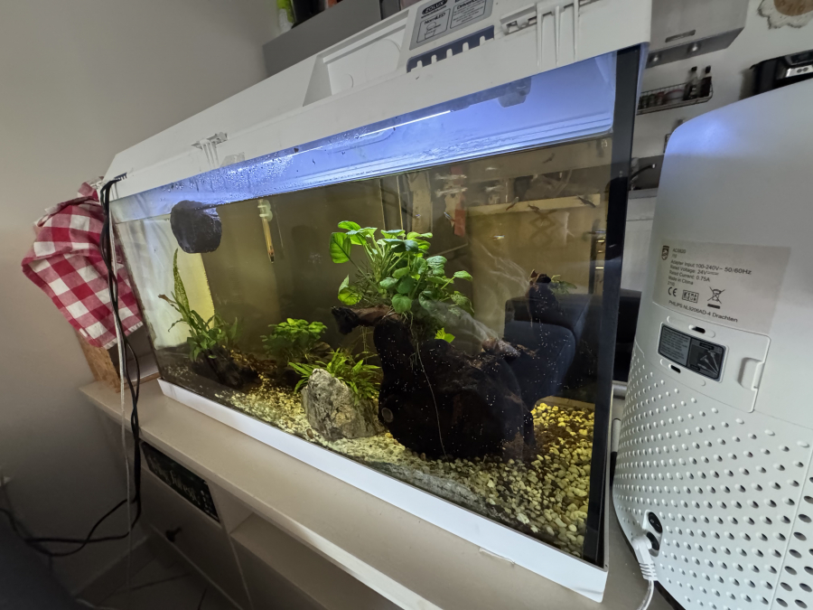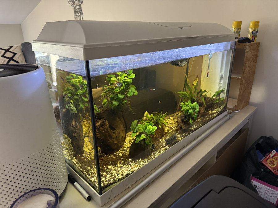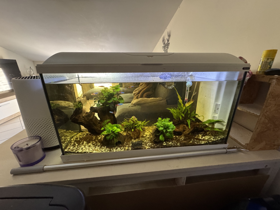 Vends aquarium de 80L Plantes et poissons et escargots inclus Contient : pompe, chauffage, thermomètre, aspirateur à aquarium, gravier supplémentaire, bulleur, décoration supplémentaire, épuisette, nourriture Dimensions : 81 longueur, 31 profondeur, 50 hauteur Tout fonctionne