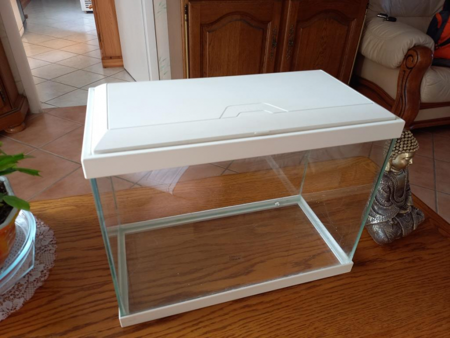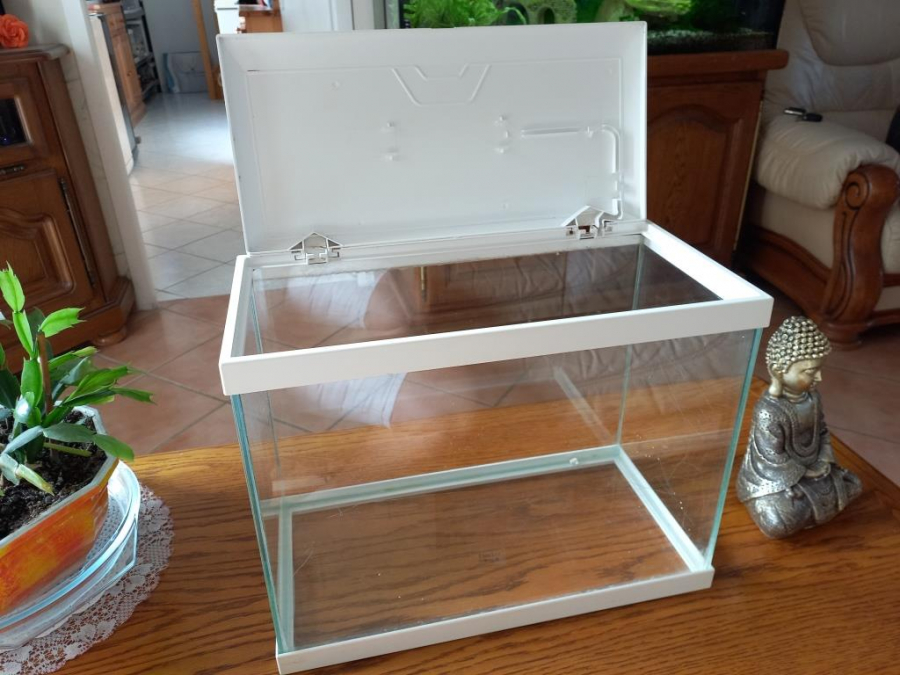 Vend un aquarium de 25 litres quelque rayure qui une fois rempli ne se voie plus et une fixation du couvercle sur les deux car la deuxième a les deux tétines cassées mais qui n'empêche pas le couvercle de servir. PLUS DE PHOTO SUR DEMANDE