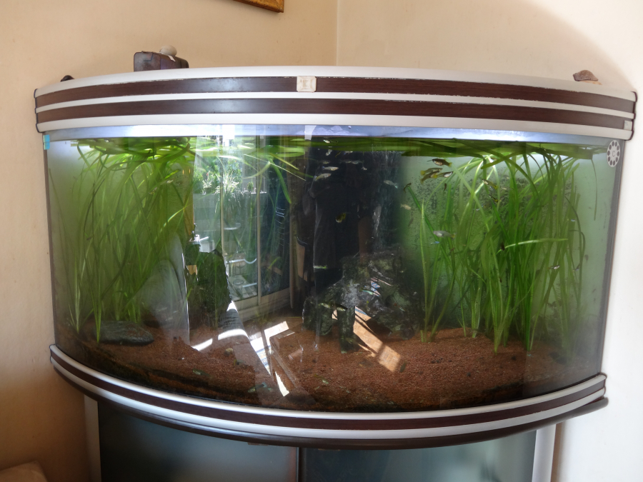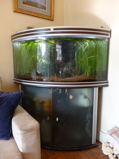 Aquarium de 350 L à offrir à un passionné. La cuve est angulaire avec vitre faciale convexe, il y a aussi le meuble avec portes vitrées opaques et accessoires. 88 cm de côté et 1,38 m de hauteur (avec le meuble). A venir voir sur place PARIS 12e. Mon tel est le 06 84 55 44 58