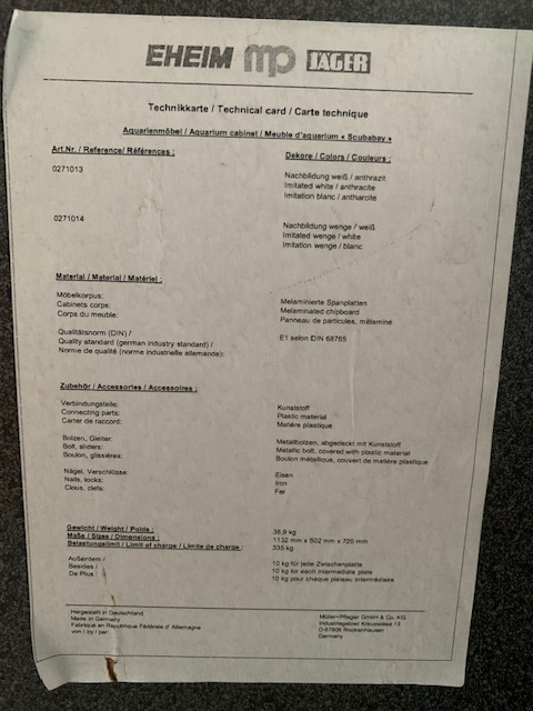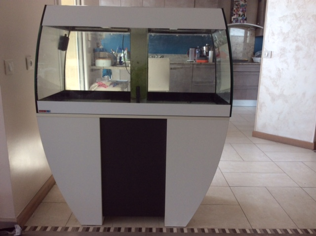 Aquarium avec meuble en deux parties; vendu avec filtre extérieur, chauffage, éclairage, UV, distributeur Eheim. Dimensions totales L 115, H 132, P 50. La cuve fait L 110 H 60 P 50 et le meuble en dessous L 108 H 73 P 60