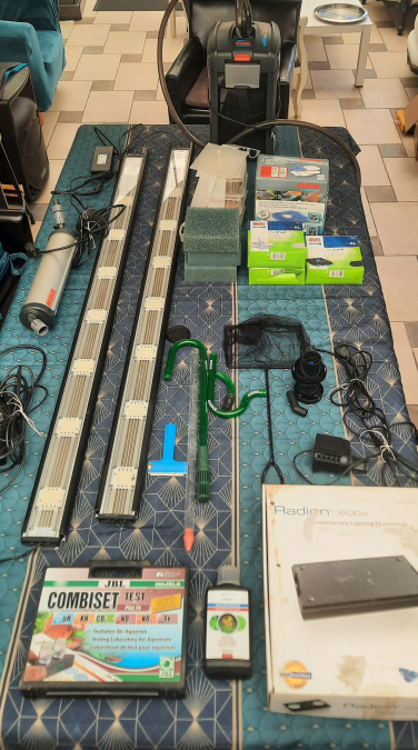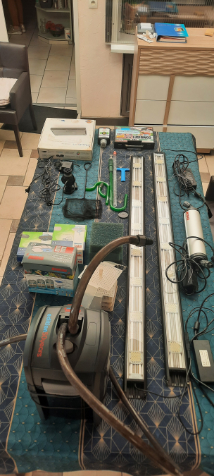 Et voici une belle opportunité. Un aquarium de 400L totalement équipé. _1 pompe à eau et de filtration Juwel professionnelle. _1 bloc lumière Led XR30w radionavigation _1 tunnel de filtration UV _1 set de test à eau _1 bouteille d'eau de fer pleine. Jamais utilisée. _1 épuisette et grattoir à lame et un jeu de de tubes de transfert (tubes de couleur vert) _2 moteur élisse. _2 filtres à charbon neuf _5 filtres en tissu neuf. _1 filtre pour la pompe de filtration Juwel Professionnel. _2 rampes de Led dont une avec un câble d'alimentation manquant. L'offre comprend le meuble avec. L'aquarium dispose sur son côté gauche et côté mur d'une tour de filtration qui fait partie intégrante de l'aquarium. Les consommables de cette tour de filtration seront certainement à changer. De même que pour les consommables de la pompe filtre juwel professionnel. Par ailleurs on retrouve derrière la tour de filtration de l'aquarium une partie non visible impossible à nettoyer. L'aquarium et son équipement ont été nettoyés une fois à l'eau au et vinaigre ménagé puis à l'eau et au savon au PH neutre. Par ailleurs les verres de l'aquarium ont été nettoyé à l'alcool médicale (Alcool isopropilique). Valeur neuf = 2300. L'aquarium est stocké sous bache de protection. Si vous venez de loin pour venir le chercher je vous offre le repas en bon citoyen ?. Ou si vous êtes sympathique si vous habitez là région ? Je vous conseil de venir au moins à 3 pour le déplacer. La partie en verre pèse un poids de voleur. ? Prix négociable