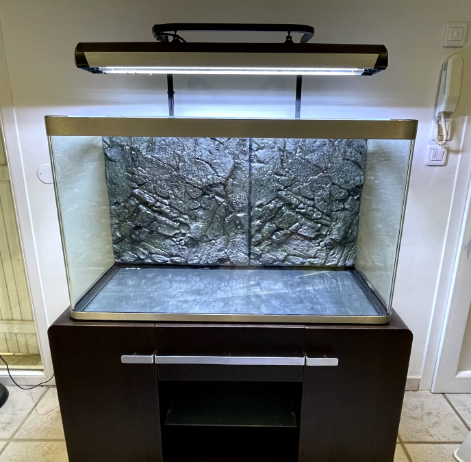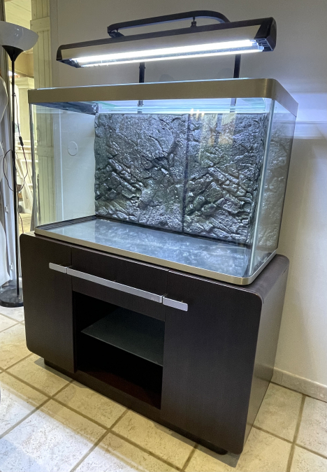 Vends Aquarium modèle Osaka de Fluval verre plié + son meuble + Décor de fond et Éclairage - Cuve haute, grande vision finition aluminium brossé en verre d'un centimètre d'épaisseur - Dimensions de la cuve : 104 x 45 x 62 cm - Volume net: 244 litres Meuble composé d'un tiroir central et de deux portes, facilitant le rangement. - finition bois - 2 portes, 1 tiroir, 1 étagère en verre dépoli - taille : 112 X 56 X 62,5 cm - Tapis de protection (entre meuble et cuve) inclus Galerie suspendue led avec 2 tubes T5 LED récents et potence