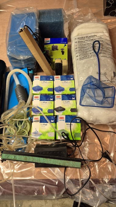 Aquarium fourni avec tous les accessoires sur la photo : - Bio coarse - Bio pad - Bio carb - Nitrax - Moteur neuf - Thermometre - Epuisette - Ouate - bulleur - aspirateur - fond bleu - brosse vitre Et en cadeau une encyclopédie Hachette aquarium pratique en 5 classeurs