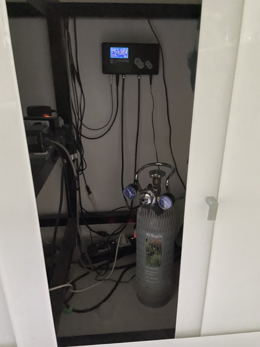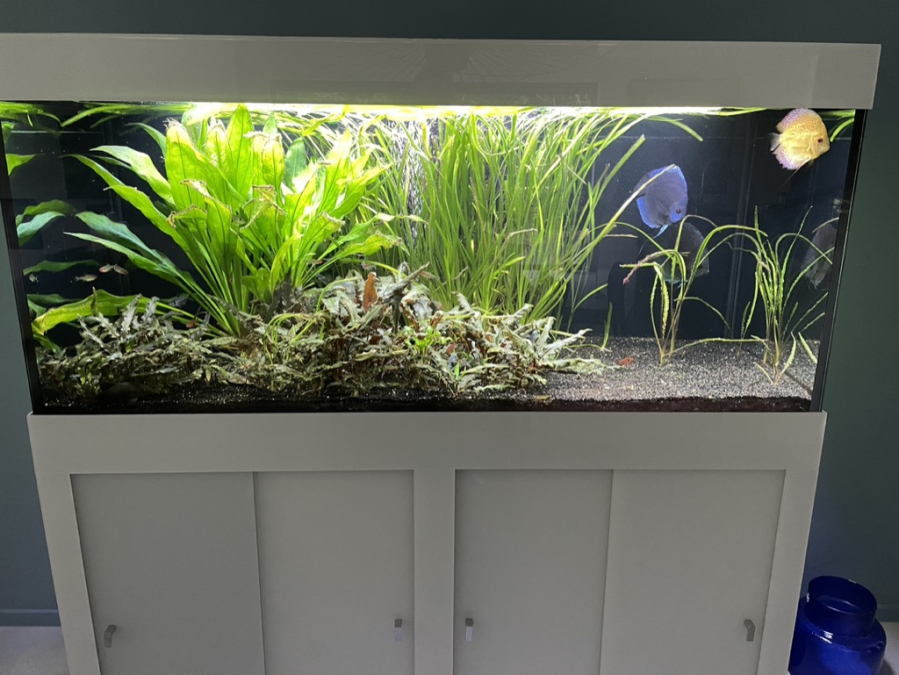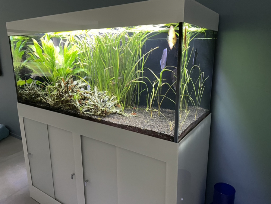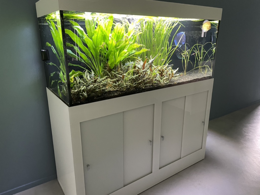 A vendre Aquarium verre Lacobel blanc dimensions cuve : 150 x 60 x 70 cm (L x l x ht) Pompes (air et eau), 3 rampes Leds + minuteur, Système JBL CO2 + 3 bouteilles rechargeables, 2 chauffages, poissons, décor.