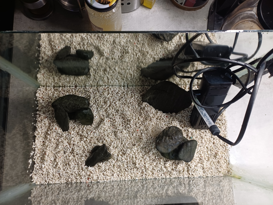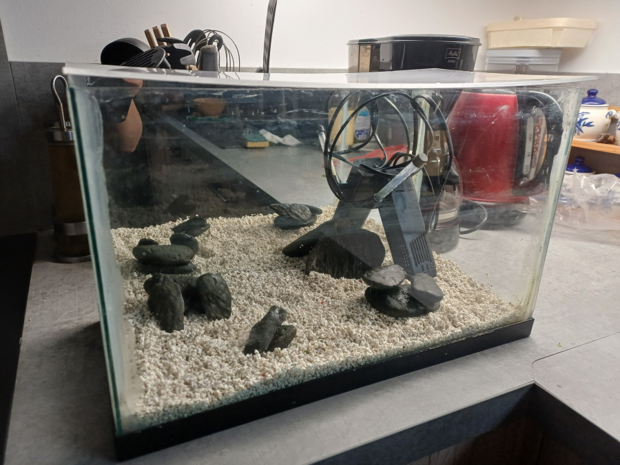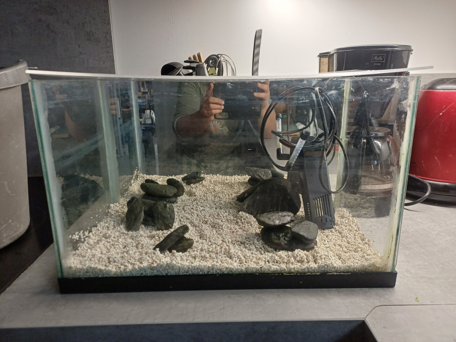 Vend aquarium 20L équipé avec sol gravier blanc, une pompe avec rampe de diffusion, des galets avec inscrustations sombres pour bel effet en eau, un grand côté de l’aquarium est composé d’un miroir, un couvercle en pexiglass. Prix ferme 40 euros A recuperer sur toulouges, pasenvoi
