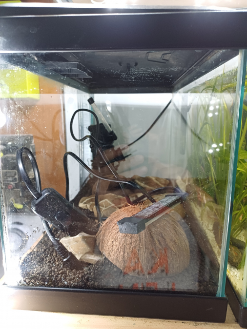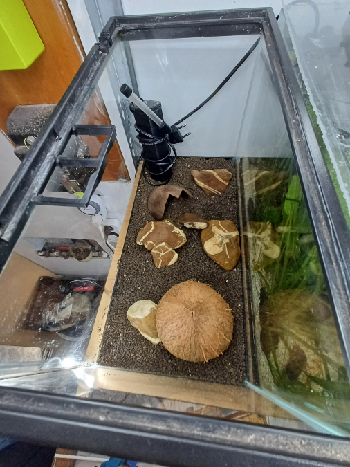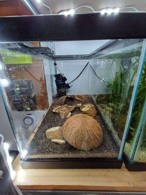Vend aquarium 20L équipé d'une pompe avec sol technique refait à neuf, couvercle en plastique, lampe led qui se fixe au couvercle, excellent état, décorations (galets marron ligné de blanc, noix de coco), excellent état assimilé à neuf car peu tourné. Possibilité d'ajouter des plantes, prix sur demande. Idéal pour élevage de crevettes caridinas et/ou néocaridinas. Prix : 55 euros, négociable si plusieurs bacs achetés voir mes autres annonces A récupérer sur Toulouges (66) ou Vias (34) ou au long de l'A9 entre Perpignan et Sète selon déplacement. Pas d'envoi.