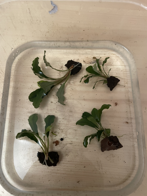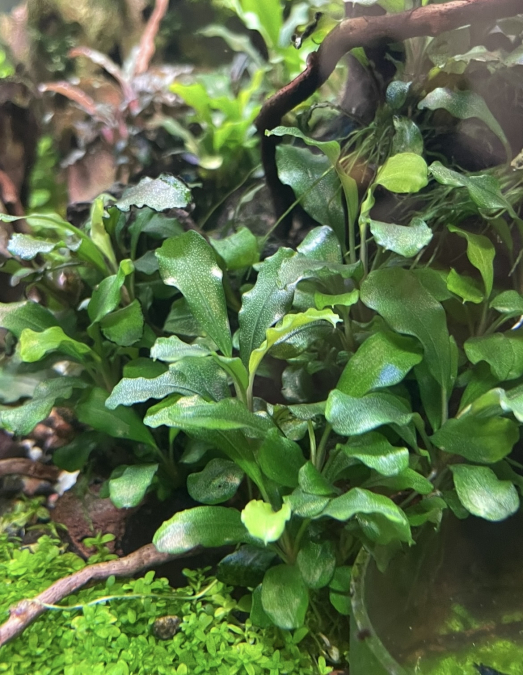 Bonjour, Bucephalandra green wavy disponible. La partie est sur la deuxième photo avec une petite pierre volcanique attachée. x4 Bucep avec pierre Merci