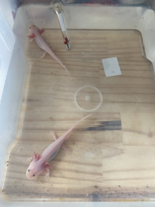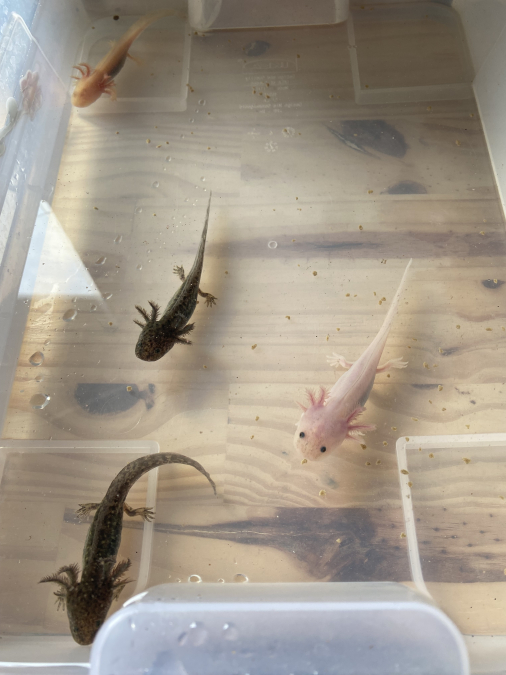 Axolotls Me reste 1 sauvage 2 leucistiques à peu près 10 cm. Pellets introduits les plus petits mangent encore des vers de vase. Maman leucistique papa sauvage.