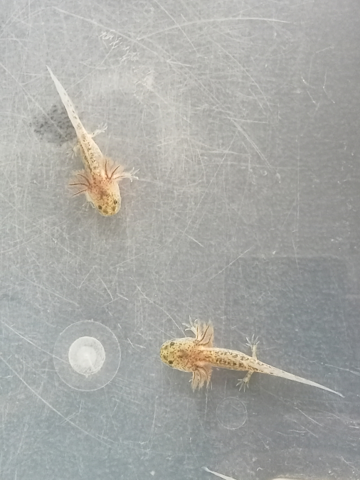 Bébés axolotls type sauvages nés en janvier disponibles mère copper et mâle gold. Ils sont nourris aux granulés s et vers de vases congelés.