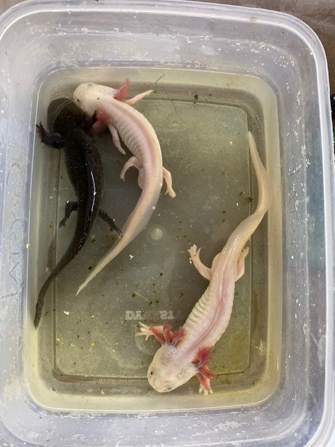 Axolotls : Leucistique 19 cm Sauvage 16 cm 30 euros l'un, 50 euros les 2, 60 euros les 3 (Voir autres photos) Ils sont habitués aux pellets. Donne un sachet de pellet 150 g par axolotl, des plantes et une souche de daphnies pulex. Visibles sur Paris 13/14.