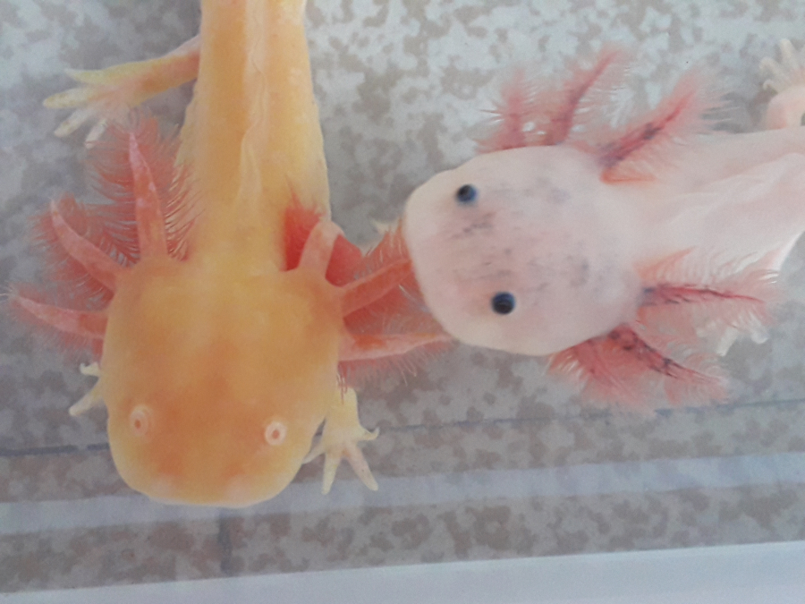 Axolotls leucistiques et albinos gold prêts à rejoindre leurs nouvelles familles.