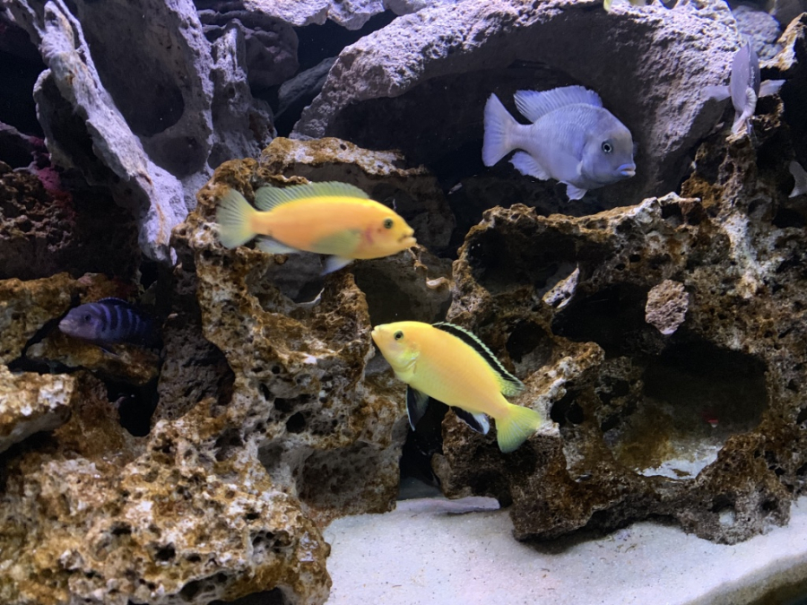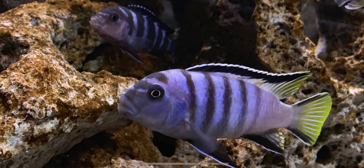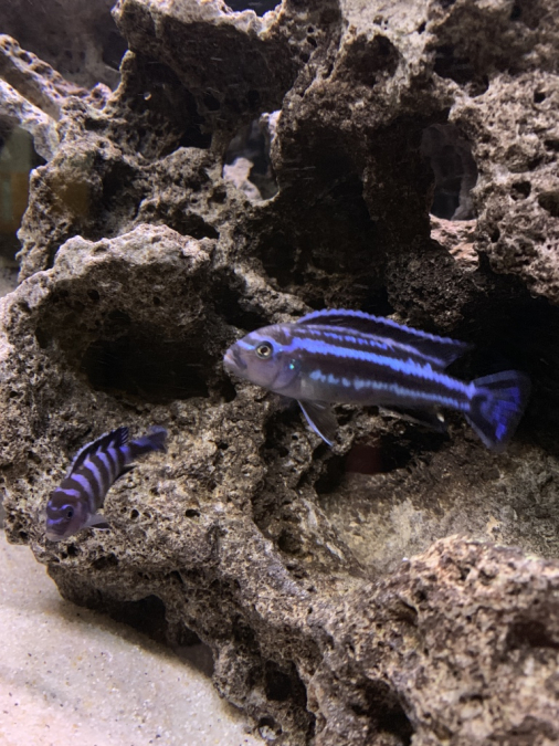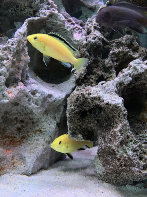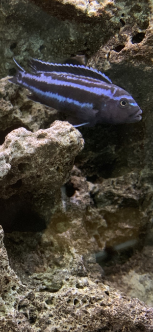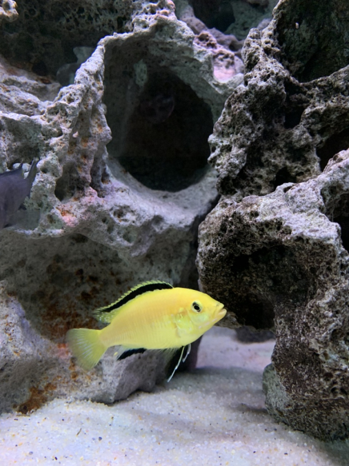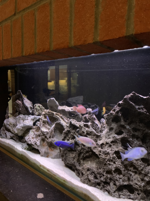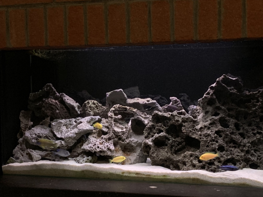 Bac monobloc équipé posé sur table Pierre de lune environ 40 Kg une dizaine de poissons lac malawi magnifique de 2 ans à venir démonter sur place à votre convenance taille : long 1m30 large 0,40 haut 0,57