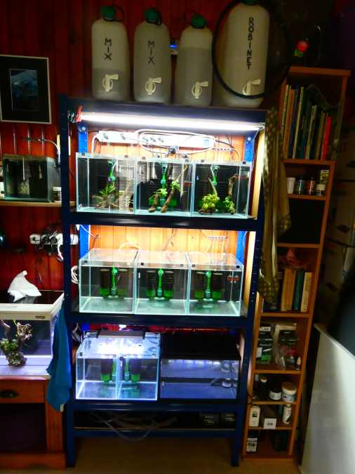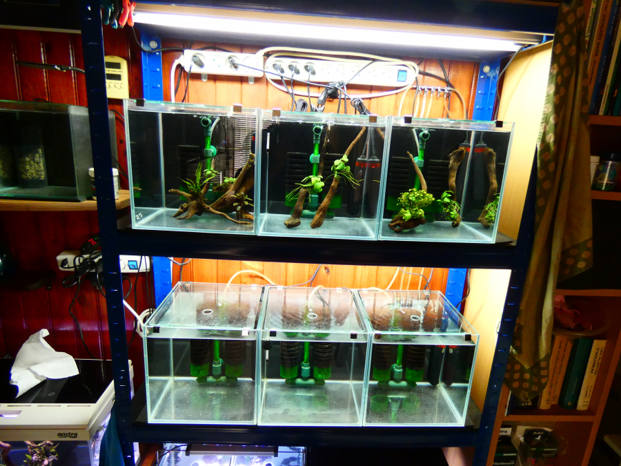 BATTERIE de 9 cuves Optiwhite (verre extra blanc) sur 3 étages composée de : _ 6 cuves de marque AMTRA 25x25x25 cm ép. 5mm/ 15L (prix de vente moyen sur le web = 50 euros piéce) AVEC couvercle en verre troué au milieu (permet d'attraper le couvercle avec 1 doigt et aussi de nourrir ou ajouter des produits sans l'enlever) ET crochets inox de maintien (avec emballages d'origine aquas + polystyréne pour le transport !) _ 2 cuves optiwhite 20x20x25 cm ép. 5mm / 10L avec couvercle troué & crochets inox. _ 1 cuve Dennerle "coins arrondis" 20x20x25 cm ép. 5mm/ 10L avec couvercle & crochets. Tapis mousse sous TOUTES les cuves & feuille pvc noire amovible entre chaque bacs pour que les males Betta ne puissent pas se voir entre eux. Materiel & équipement : _ 9 filtres double exhausteurs de marque QUANVI avec média en céramique EHEIM neuf dans chaque compartiments + EPONGES neuves. _ Une pompe a air SCHEGO (fabricat° Allemande) Optimal 250L/H (trés peu servie) réellement silencieuse et durable + 3 filtres de rechange. Amplement suffisante pour alimenter tous les filtres de la batterie. _ 9 chauffe-eau VISITHERM Mini 10W thermostatés a 26°c (non réglable) incassables & avec témoin lumineux. _ Plusieurs métres de tuyau a air silicone pour relier la pompe a air aux filtres + répartiteurs inox 2X 5 voies & 1X3 voies _ 1 ballast éléctronique a embouts étanches sur cables de marque GLO 2X 39 watts pour tubes fluos T5 (vous pouvez avantageusement remplacer les tubes T5 fluos par des T5 a LEDS). _ 3 mini thermo. Dennerle. _ 1 multiprise LEGRAND 8 emplacements avec interrupteur. _ 1 MEUBLE "5 étagéres charges lourdes" (350 kg par étagére) en acier 90X30X180h cm. (équipé sur les 2 étagéres du haut de caches/réflecteurs pour fixer & brancher les tubes, les 3 cuves du bas ont 1 éclairage indépendant). Je fournis 4 tubes T5 usagés , ils sont bons a changer (2 Dennerle Amazon Day + 2 Sylvania 840 HO). Je fournis également 2 bidon de 10L avec robinet pour les changements d'eau. AUCUNE rayure ou trace de choc ... Le tout est en trés BON ETAT. Tout est démonté, nettoyé et pret a étre emporté ... Idéale pour les Bettas car les chauffe eau sont réglés d'usine en fixe a 26°C. Permet de garder vos males & femelles séparés. Pour le repro il faudra bien sur des cuves + grandes a coté pour faire grossir les alevins ... Pour des crevettes ou autres petits poissons, il faudra changer les chauffes eau pour des modéles réglables. PAS D'ENVOIS, a venir chercher sur place.