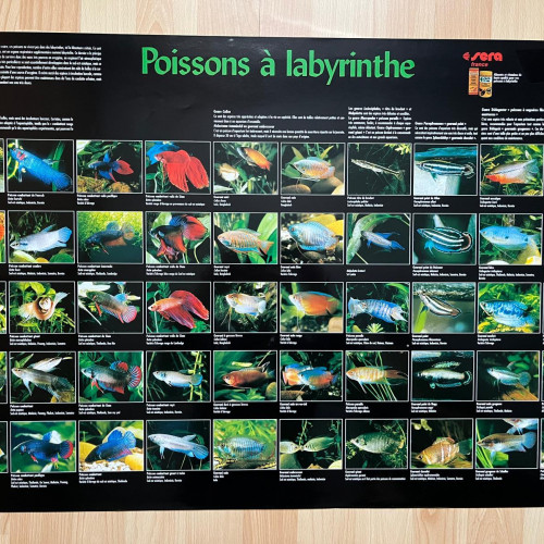 Vends un magnifique poster avec de très belles photos de Labyrinthidés. Papier glacé brillant. Poster neuf non plié ni troué, pas de trace de scotch. Conservé à plat. Dimensions : 78cm X 53cm Envoi possible dans un emballage soigné. Plusieurs exemplaires disponibles.