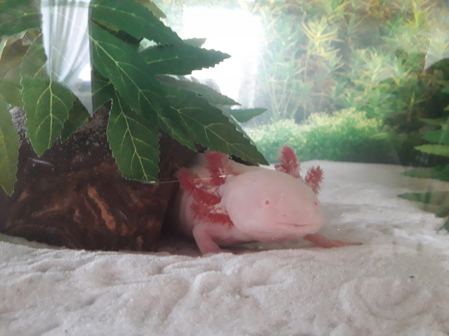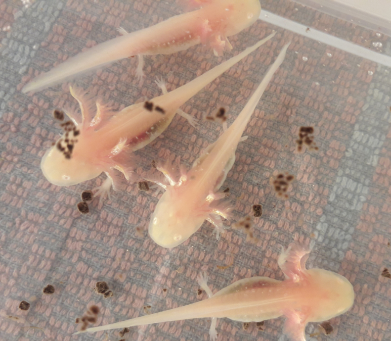 Bébés Axolotl, ils seront disponibles à 10 cm aujourd’hui ils font entre 6 et 7 cm. Ils mangent des pellets et des vers de vase. Maman est gold et papa albinos. Photos sur demande