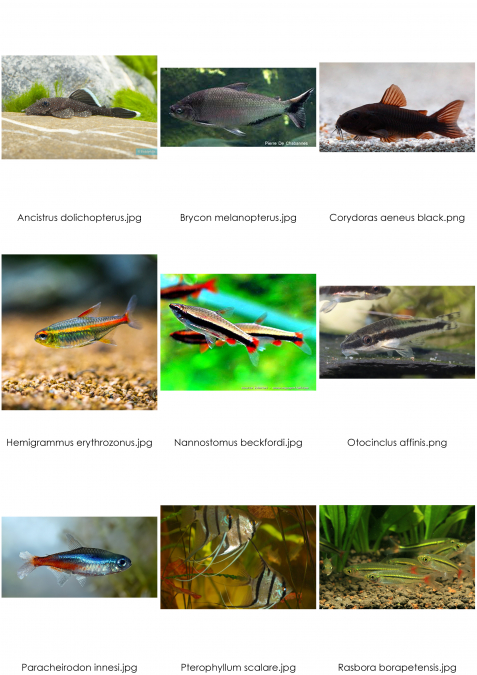 bonjour, je cherche les poissons suivants: "Ancistrus dolichopterus (Ancistrus)" "Brycon melanopterus (Tête de jaguar)" "Corydoras aeneus black (Corydoras argenté)" "Hemigrammus erythrozonus (Tetra à queue rouge)" "Nannostomus beckfordi (Tetra à nez rouge)" "Otocinclus affinis (Otocinclus)" "Paracheirodon innesi (Tetra néon bleu)" "Pterophyllum scalare (Scalaire)" "Rasbora borapetensis (Rasbora arlequin)" N'hésitez pas à me contacter si vous en disposez. MERCI!