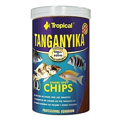 Chips spéciaux à multi ingrédients pour grands cichlidés du Lac Tanganyika des espèces Altolamprologus, Julidochromis, Lamprologus, Neolamprologus, Lepidiolamprologus, jeunes Cyphotilapia frontosa et autres, dont le régime est surtout basé sur du matériel animal.