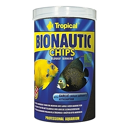 Nourriture sous forme de chips compactes pour poissons marins omnivores et crustacés.