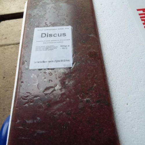 La nourriture congelée est conditionnée en plaque de 500 grammes et est idéale pour les poissons omnivores. Mixte, elle est composée de coeur de boeuf et d'épinards ainsi qu'un complément en ail en prévention des vers. Formule particulièrement appréciée des Discus.