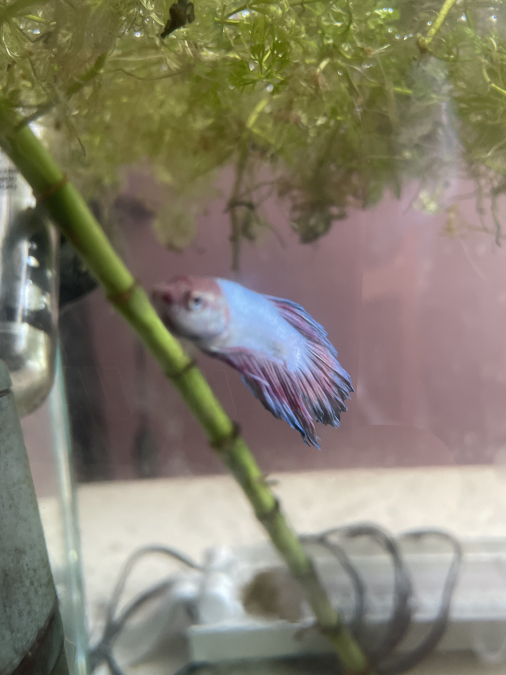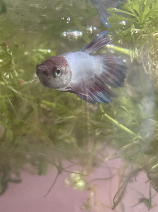Combattant azur 2-3 cm. Il est interactif et ses nageoires sont un minimum entretenu mais peuvent reprendre assez vite ou quand il ouvre des nageoires c est comme même a jolie