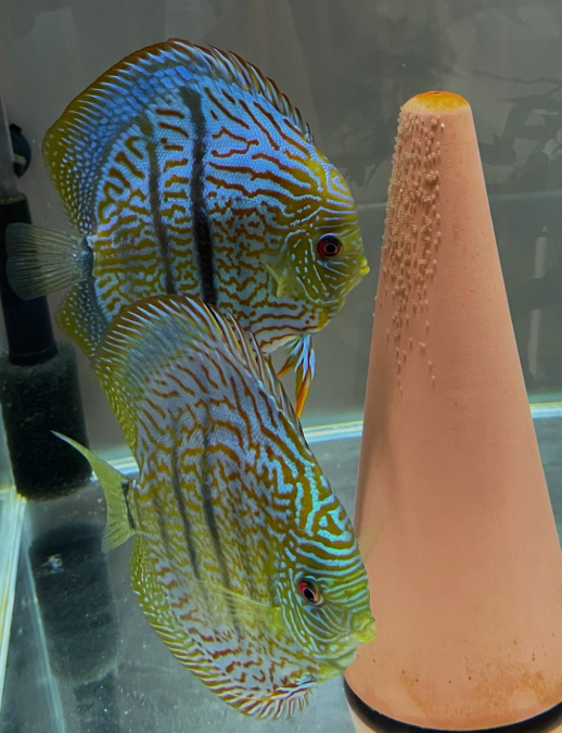 Couples confirmés de discus qualité premium - variété: Heckel cross "wild type" - origine: élevage "Discus JDL" - taille: 14-15 cm (males)/ 12-13 cm (femelles) - age: 30 mois - nombre dispo: 3 couples confirmés (pondent tous les 5-7 jours) - status sanitaire: animaux d'élevageen plein santé, garantis sans parasites (origine discus JDL, élevage dans un bac dédié et n'ont jamais cotoyé d'autres poissons). - conditions d'élevage: nourris granulés, pâté maison et vivant, élevé dans un 550L (discus uniquement), dureté KH=4 (100 ppm), Ph=7, Temp=28°C. Les discus vivent en groupent et nécessitent un volume d'eau important (>300L pour deux couples). Ces poissons nécessitent de réelles compétences en aquariophilie et des conditions de maintenance particulières (changements d'eau réguliers, zero nitirites, eau douce peu minéralisée, ...). Pas sérieux s'abstenir. A venir récupérer sur place dans le 38410, pas d'envoi possible. Photos/videos sur demande. Le prix indiqué est par couple (200 le couple) Merci de me contacter par avance.