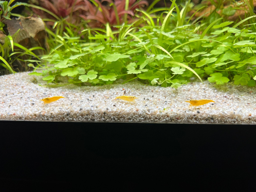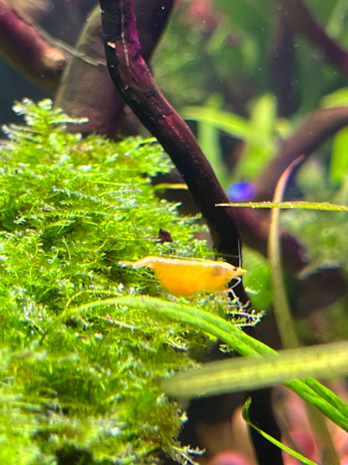 Crevettes jaunes en pleine formes à donner, dans mon bac 145l, 25°, KH5, PH entre 6,8 et 7,5.