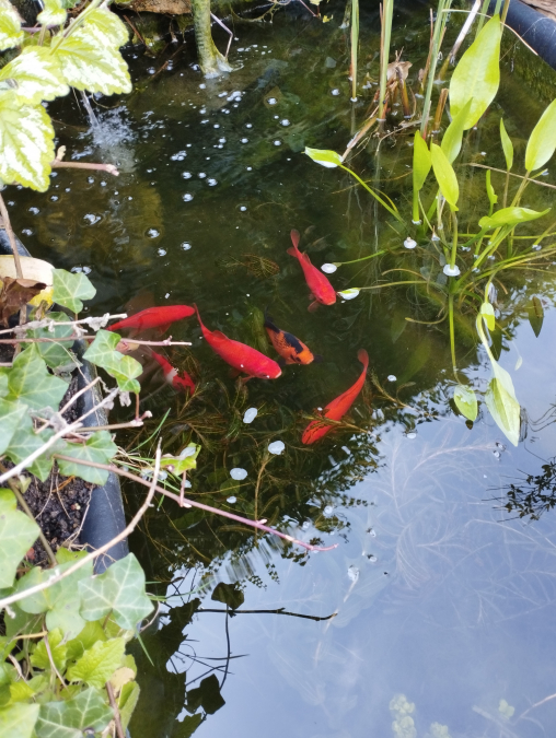 Je donne 9 poissons rouges contre bons soins blancs, noir, rouge et blanc