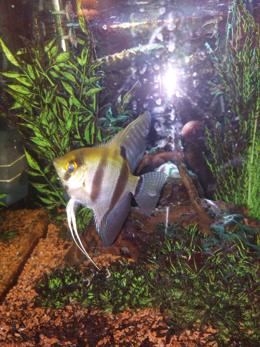 Donne un scalaire- age 2 ans - très en forme. nourri crevettes et artemia. Cause aquarium trop petit.