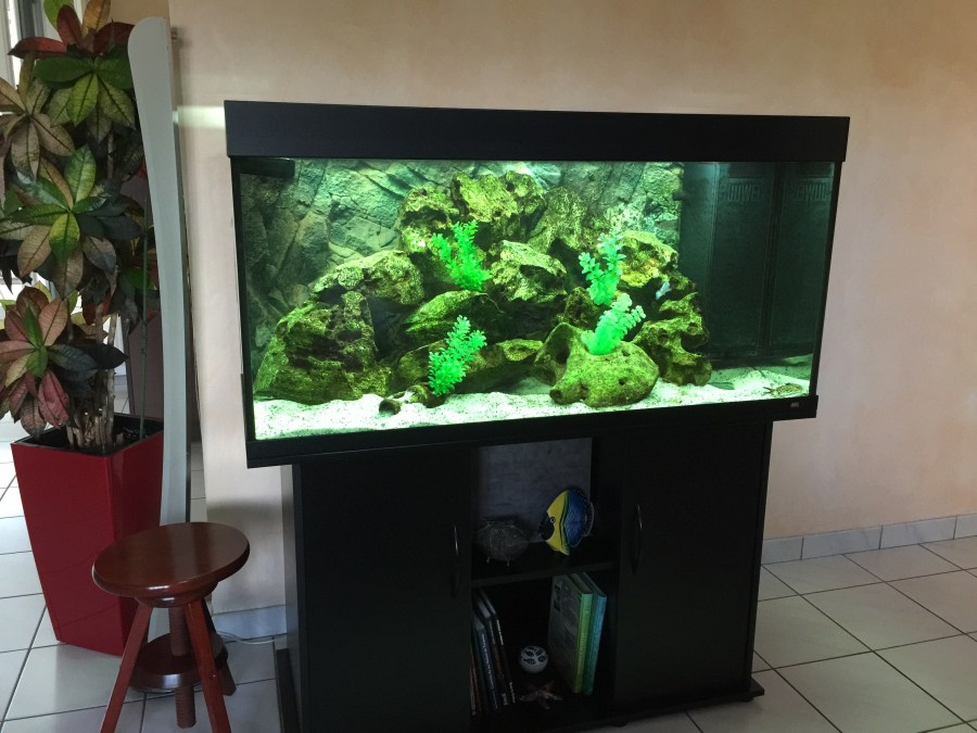 Donne aquarium juwel Rio 300 120x50x68 et son meuble (voir photo) Bon état Équipement complet Résistance et pompe récentes Le décor est fait avec des pierres de rocailles et peut être récupéré également si souhaité. Reste 4 poissons à récupérer : 1 couple de pseudotropheus 1 synodontis 1 ancistrus
