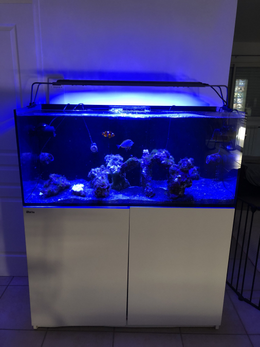 Donne aquarium recifal 245L (eau de mer) complet : Lampe/ 6 Pompes de brassage / Écumeur/ Pompe de dosage/ 2 Réacteurs / Chauffage … Plus animaux : 1 Océlaris/ 1Cardinal/ 1 Anémone Magnifica/ 20Kg de pierres vivantes/ 2 Oursins Diamenes/ Sable vivant noir/ …