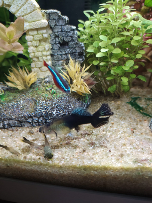 Bonjour, Suite à plusieurs naissances, et à un aquarium surpeuplé, je recherche une ou des personnes intéressées pour accueillir des alevins guppys. La photo ci-jointe montre la mère et quelques alevins, je peux fournir des photos du père également. Le prix est négociable s'il l'accueil est bon.