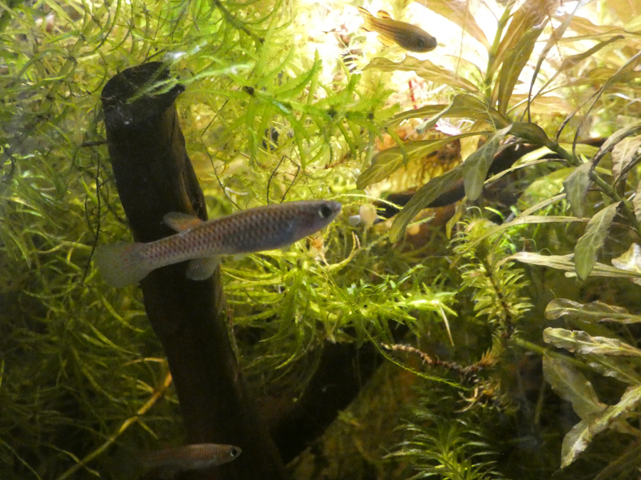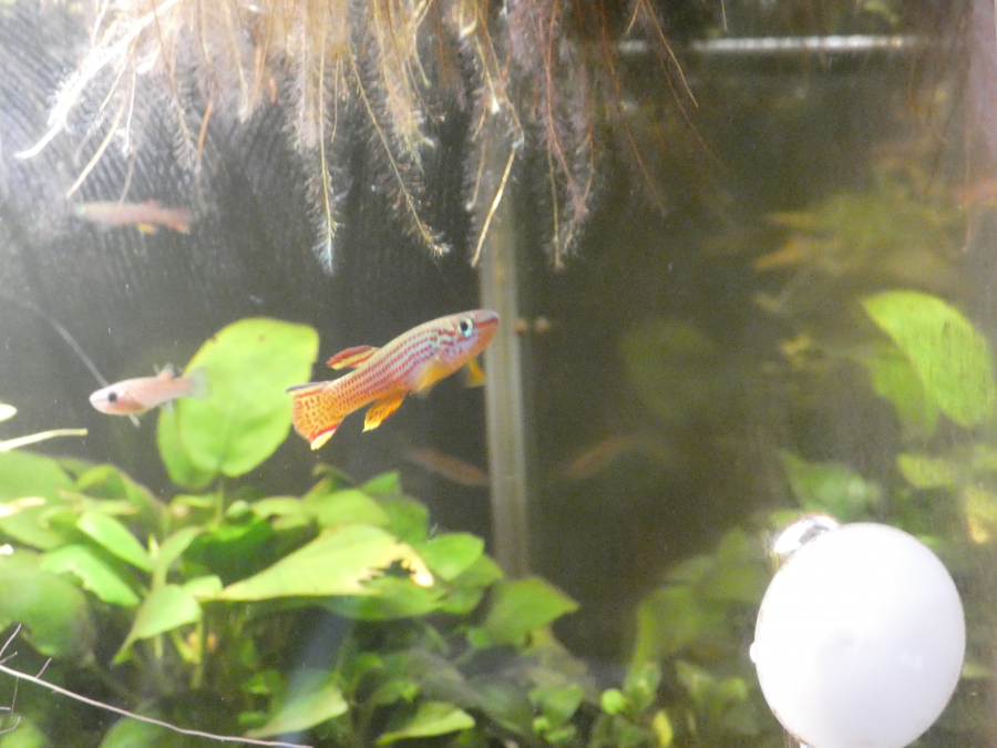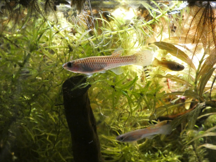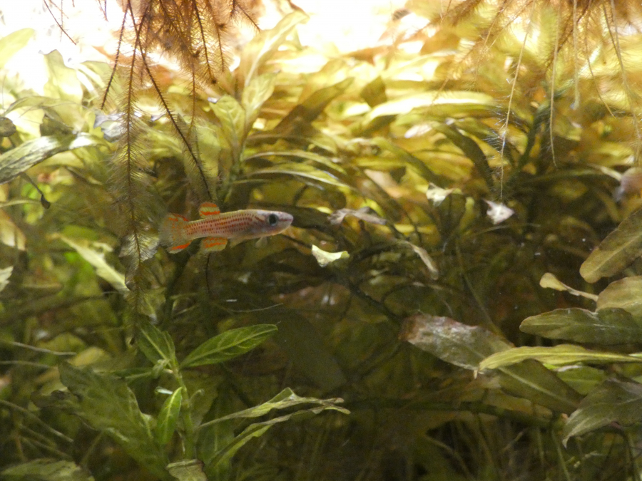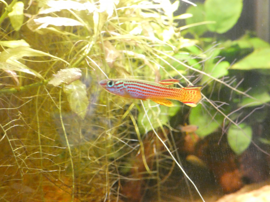 Mon trio d'aphyosemions striatum étant assez actif, je donne en main propre des jeunes mâles et femelles de quelques mois (je ne saurais pas dire quel est leur âge exact, ils ne sont pas tous de la même ponte).