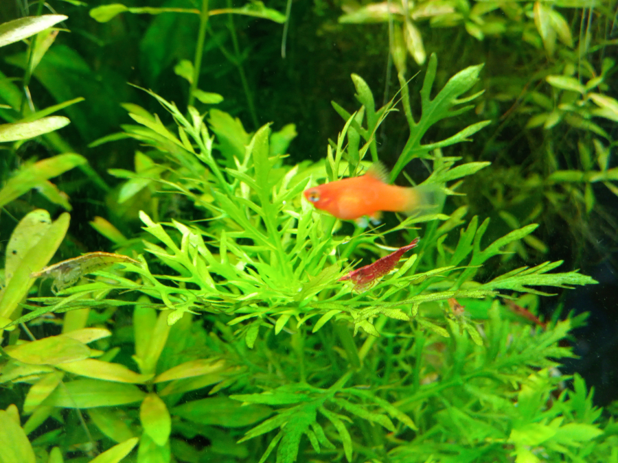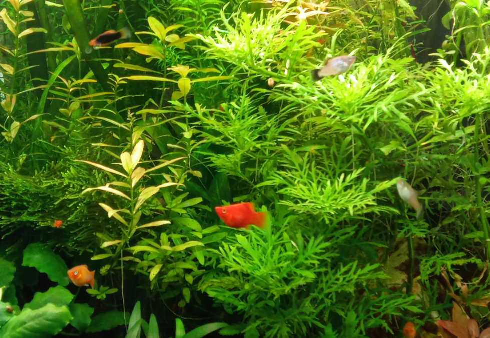 Suite repros (sans surprise), donne jeunes Platys de mon bac (juvéniles ou sub-adultes). Plusieurs coloris car parents de variétés différentes (tuxedo, sunset, gold,...). Parfaite santé, dans bac communautaire bien planté, PH=7.2, KH=6, GH=12.