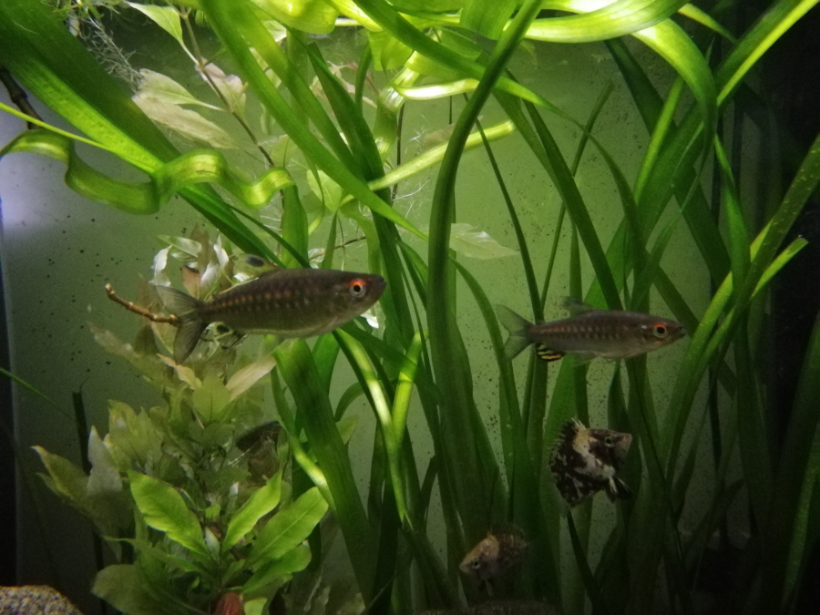 Suite à la canicule de l'année dernière mes bancs de ces deux poissons ont été décimées. Ces trois la sont les seuls survivants...et je ne souhaite pas renouveler l’expérience de cette maintenance. Les spilopterus sont en pleine forme (1 male et 1 femelle) et le phenaco (1 male) également malgré un oeil borgne probablement du à une bagarre mais parfaitement cicatrisé. Il ont tous un comportement alimentaire et général apaisé mais je suppose tout de même un manque au niveau du besoin grégaire. Si quelqu'un disposant d'un banc de tetras digne de ce nom acceptait de les accueillir pour leurs vieux jour ils seraient probablement plus heureux...