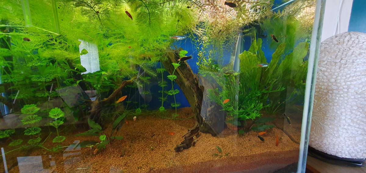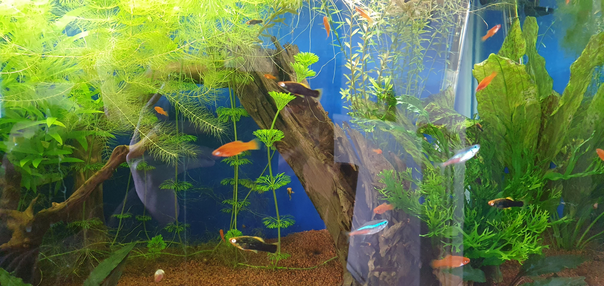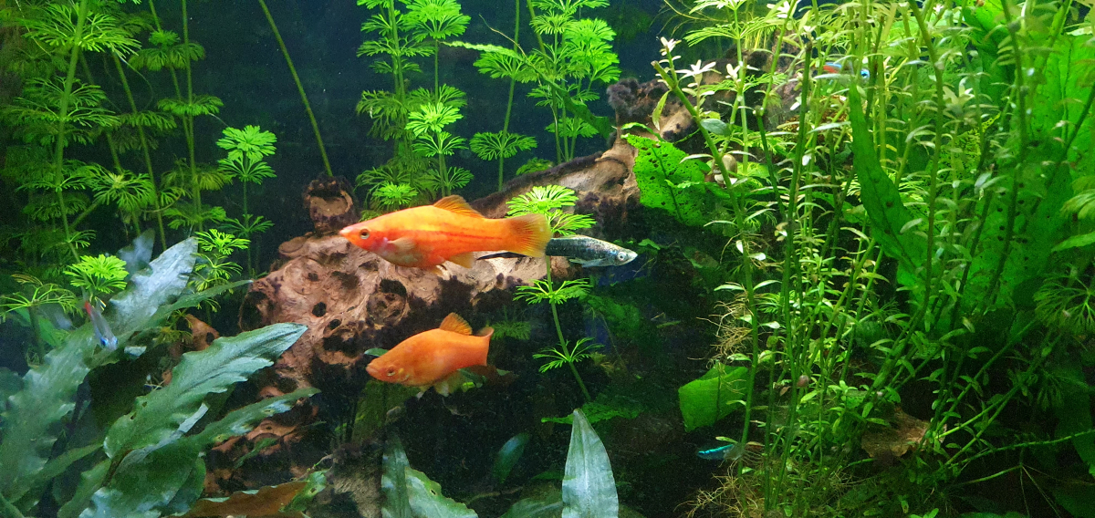 Suite à de multiple naissance naturelle, je vends ou échange mes jeunes Xiphos trop nombreux. Certains males sont déjà identifiable. Sur la première photo, on voit les parents : les deux femelle rouges et le male noir argenté en arrière plan.
