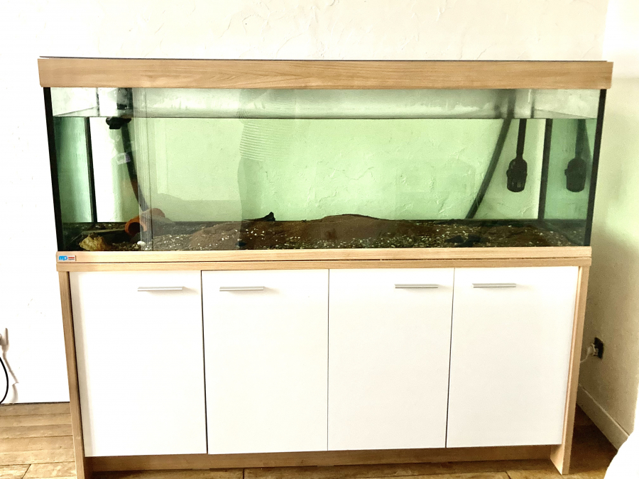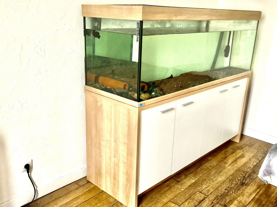 Aquarium Eheim mp Scubaline 640 L 180x60x60 Meuble avec 4 placards. Vendu sans pompe, sans éclairage, sans décors. Aquarium vide en l’état. A venir chercher sur place