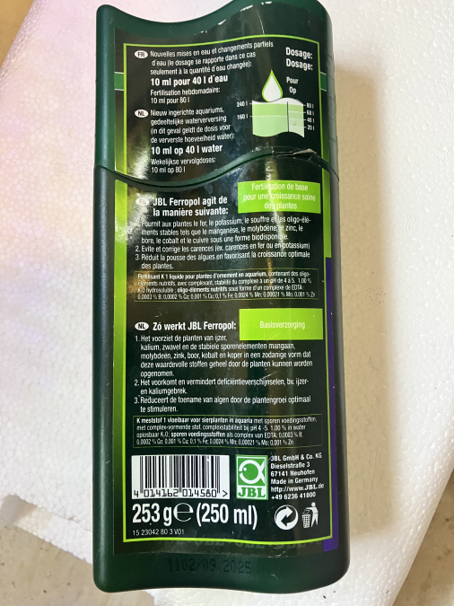 Bouteille d’engrais de 250 ml de Ferropol de la marque jbl , ⚠️contient du fer et du cuivre ⚠️. Donc nocif pour les invertébrés comme les crevettes ? et les écrevisses ? Prix :8€ J’ai d’autres engrais qui ne sont pas nocif pour invertébrés. Nanterre