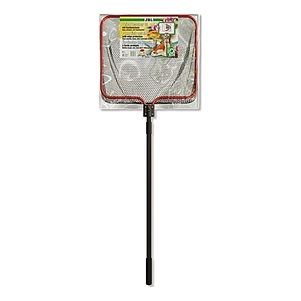 Épuisette avec filet noir à grosses mailles. Pour capturer les poissons et retirer les feuilles. Fixation 4 points du filet et embout de manche avec poignée en mousse.