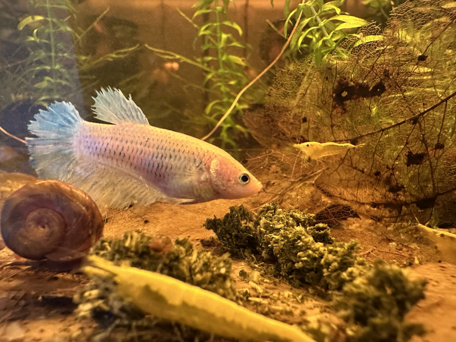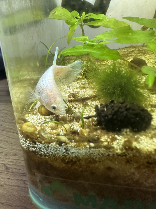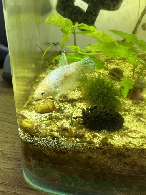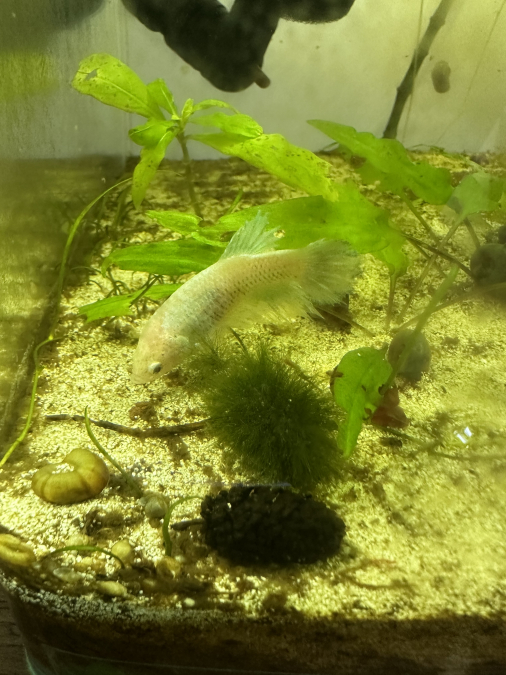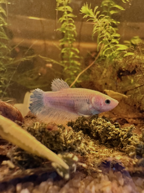 Femelle betta cellophane 2 ans Splendens Taille: 4,8 cm A été reproduite 2 fois ?️ Alimentation • Nourriture habituelle : vers de vase, artemias, granulés bassleer • Fréquence : 2 fois par jour ⚠️ Santé & Comportement • Caractère / tempérament : suiveuse, pas dominante, très sociable (cohabite avec crevettes) • Historique maladies / soins : aucun