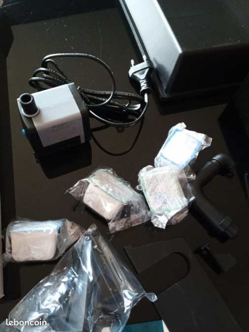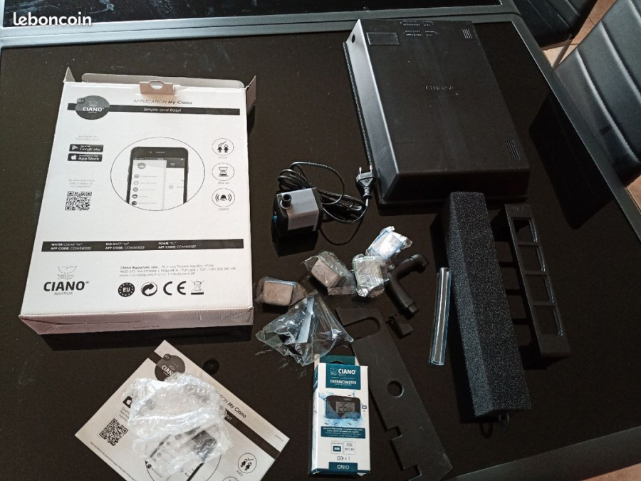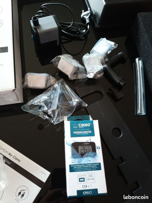 Filtration interne aquarium cfbio 250 Ciano complète pompe de rejet 550 litres heure, connes de rejets thermomètre digital submersible, masses filtrantes et mousse. Vendu sans le chauffage. Pour aquarium jusqu'à 180 litres. Jamais servie car filtration externe.