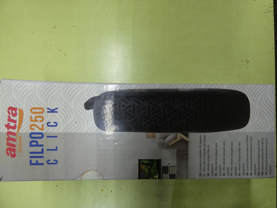 Filtre AMTRA Filpo 250 NEUF (servi qq jours) dans son emballage d'origine + 2 façades-grilles/cartouches filtrantes de rechange neuves. _ Débit réglable de 0 a 250L/H _ Consommation = 4 watts _ Compartiment interne pour mettre le média filtrant de votre choix (ouate, céramique, etc) _ Mousse préfiltration + grille de séparation interne _ Coude de rejet orientable _ Canne percée de rejet fournie _ Fixation par ventouses _ Silencieux _ Fournie avec 2 façades/grilles supplémentaires NEUVES (3 au total)... Une avec ouate, 2 avec charbon actif