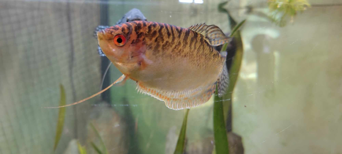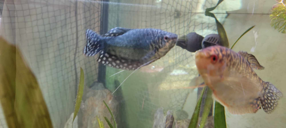 4 Gourami, 1 bleu et 2 jaunes. 2 plus grands que le dernier jaune (environ 10cm, et sans doute 7/8cm pour un des jaunes)