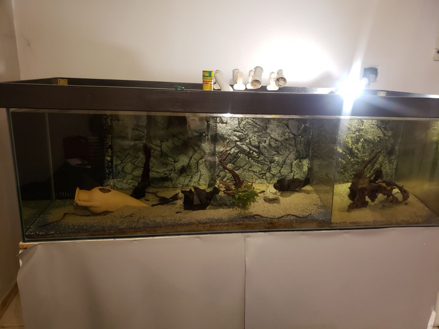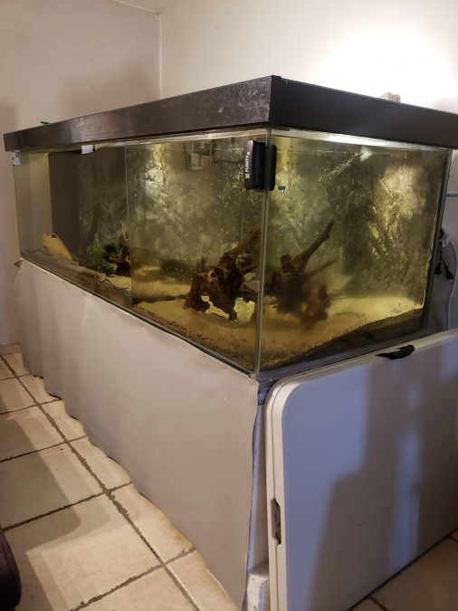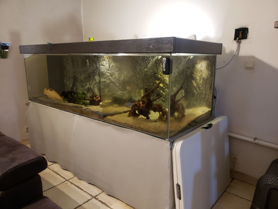 Grand aquarium, Dimension 2.10* 75*60 soit env 950 litres. 1 chauffage 500watt et 1 250watt. Sable substrat env 15 a 20 kg. Nombreuses pierres et racines de décoration, décors de fond imitation pierre. Décante externe fait maison env 140 litres avec mousse et pompe de relevage. Piranha pristobrygon + scalaire + 2 poissons "lèches vitres" Cet aquarium et les poissons nous sont laissés par les anciens propriétaires (aquariophiles) de la maison que nous achetons. N'y connaissant rien, nous souhaitons revendre le tout. L'ensemble est en bon état, et vaut probablement plus de 1000e (l'aquarium seul vaut bien 800e, + les accessoires...). Le faible prix s'explique uniquement par le fait que nous sommes pressés de le vendre ! A venir récupérer sur place (prévoyez quelques amis pour vous aider). Il y a déjà un bac de transport pour un poisson,donc il en faudrait un 2eme (on evitera de mettre le piranha avec les autres)