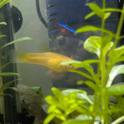 Espèce : Poecilia Reticulata Genre : femelle Caractéristiques : jaune adulte