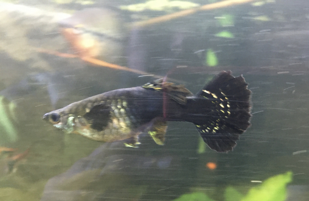 Guppy femelle d’environ 6cm, nageoire dorsale pointée de jaune à bleue, nageoire caudale en panaché de jaune orangé, reflets de mêmes coloris sur les écailles ventrales