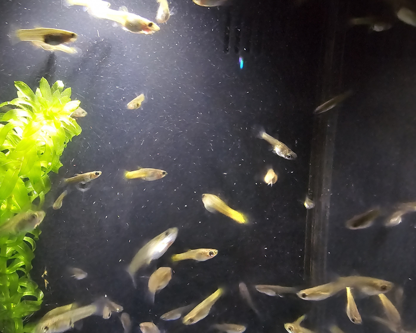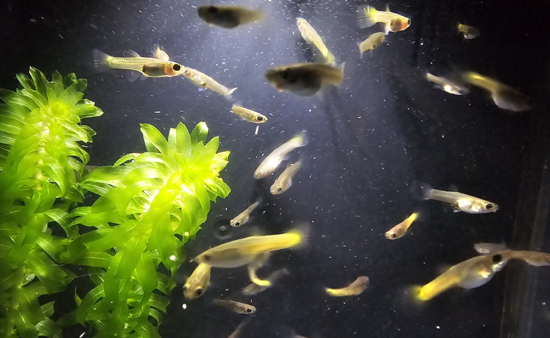 Jeunes ( -6mois) guppys femelles avec une belle couleur jaune au niveau de la queue. Je possède aussi des jeunes à couleurs neutres (gris). Certains possèdent des couleurs sur les nageoires.