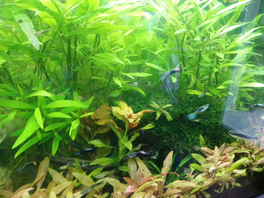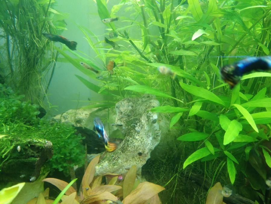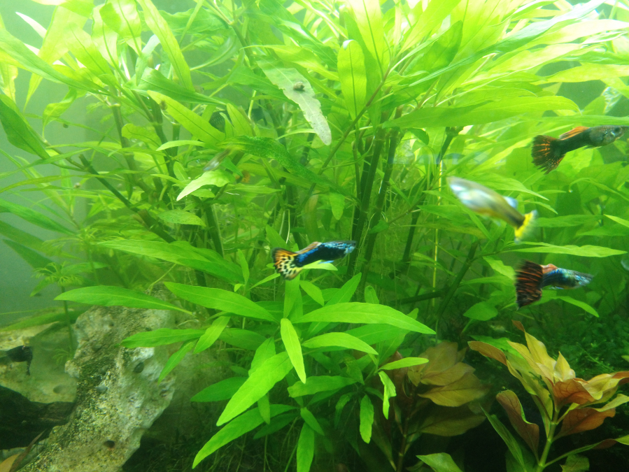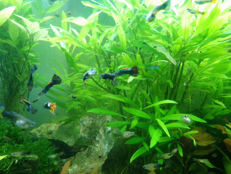 Guppys mâles types tuxedo, mosaïques et cobras dans un bac de 240 litres mature et très bien entretenu